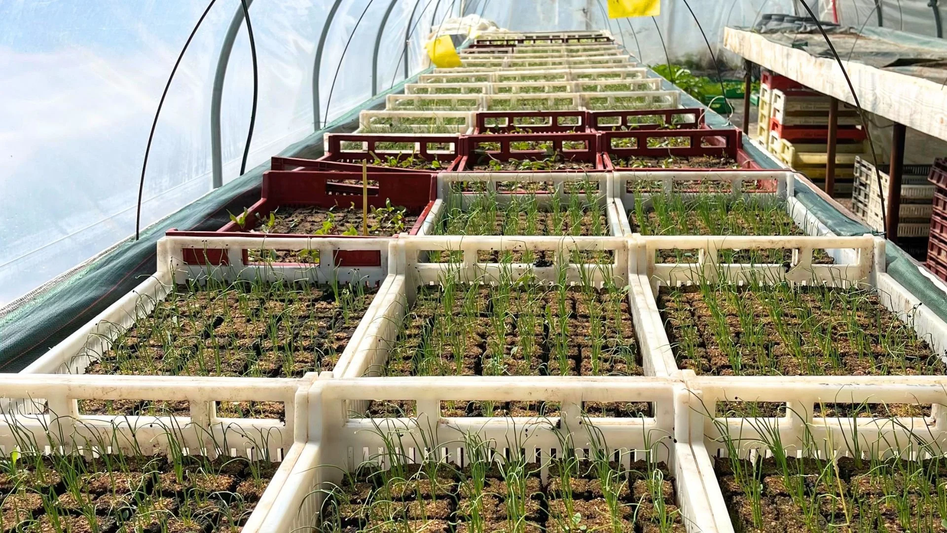 Les plateaux reposent sur des nappes chauffantes réglées à 18 °C la nuit et 22 °C le jour. Le soir, un filet climatique posé sur des arceaux vient compléter la protection thermique. Cette combinaison crée un environnement stable et favorable à la levée.