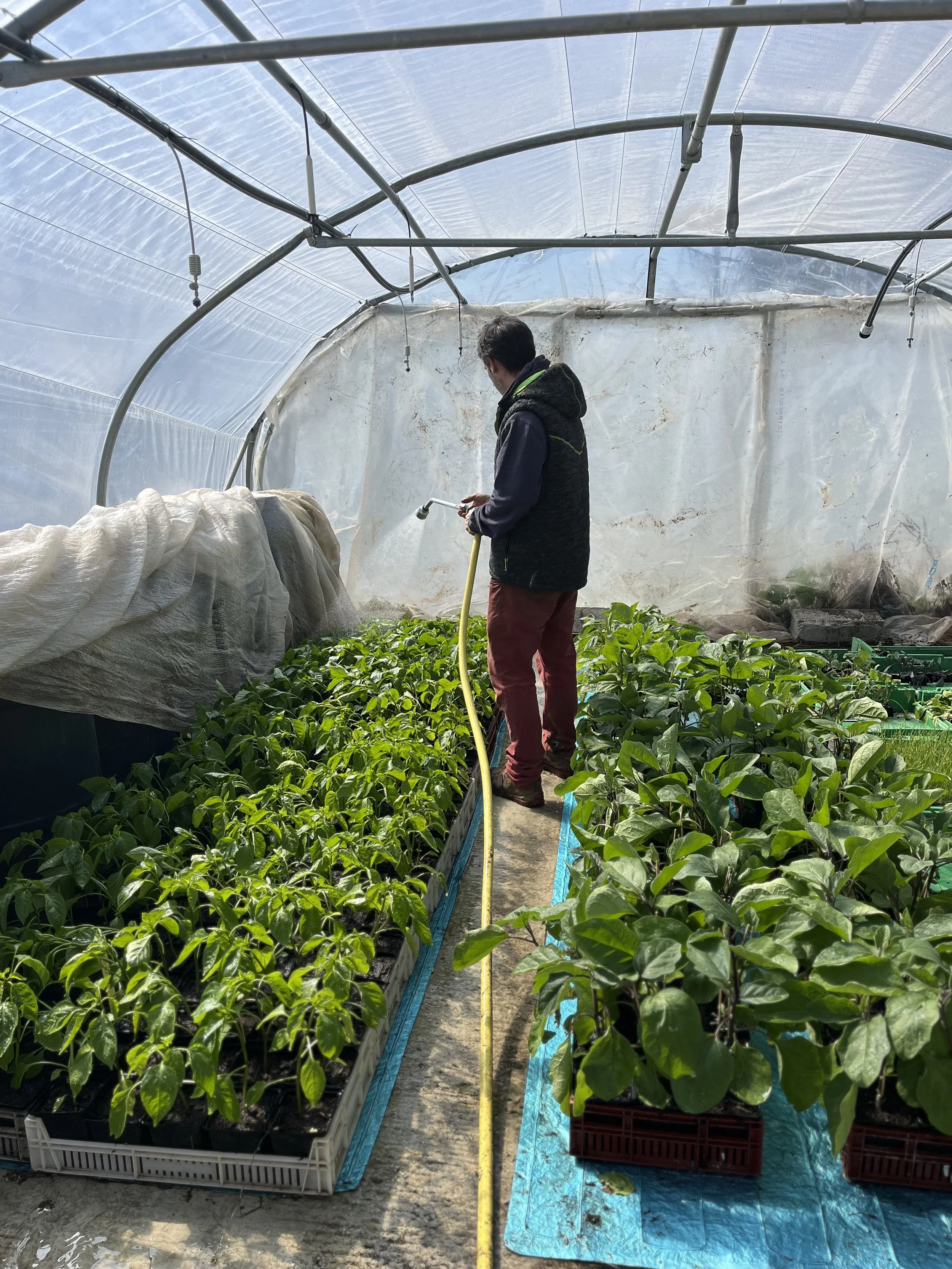 Une particularité de l'organisation ici consiste à acheter les plants de solanacées (aubergines, poivrons, tomates) début mars, en même temps que les plants de cultures froides. Aubergines et poivrons sont rempotés dans du terreau et conservés plusieurs semaines en serre avant d'être mis en place. Leur plantation est prévue aux alentours du 15 avril, le temps que les serres et les sols se réchauffent suffisamment. Ces deux espèces sont très sensibles au froid, et avec des gelées encore annoncées à −1 ou −2 °C, prendre ce risque ne serait pas raisonnable.