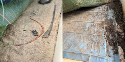 La seconde table est équipée de nappes chauffantes horticoles. Il s’agit de câbles intégrés entre deux feuilles d’aluminium, très simples à installer. Ici, pas de sable : la nappe est posée directement sur le polystyrène, puis recouverte d’une toile tissée pour améliorer le confort de travail et faciliter le nettoyage.